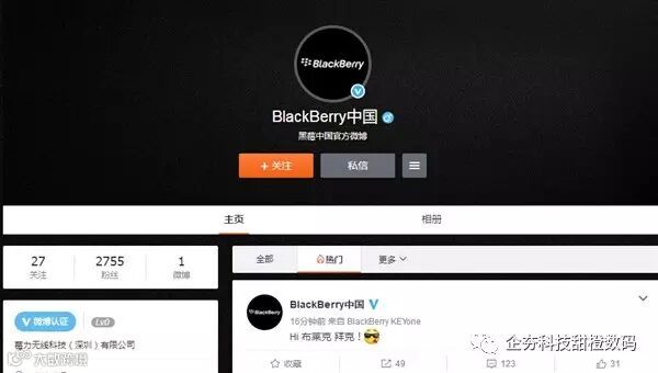 本月初,一个名为“BlackBerryMobile”的微博正式上线,其认证信息为莓力无线科技(深圳)有限公司,简介为为用户提供最新的BlackBerry产品资讯与服务。 而现在,该微博正式改名为“BlackBerry中国”,并发布了首条博文“Hi 布莱克 拜克!”。