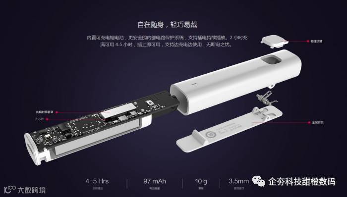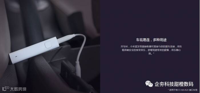 功能方面,其支持一键操作以及一带二,同时还能放在带有3.5mm AUX接口的车上使用。