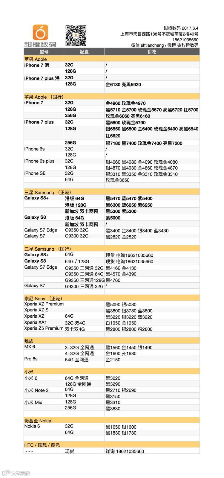 索尼 Xperia XZ Premium 大受欢迎,价格不降反升,各款次旗舰机型均有不同程度小幅走低;三星 Galaxy S8/S8+ 港版机型则是稳步走低;iPhone 7 128G 国行版走低 2、30 元。