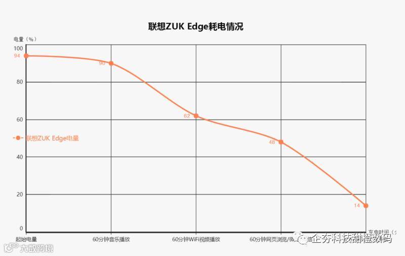 联想ZUK Edge在经过60分钟的音乐播放、60分钟的WiFi视频播放、60分钟的网页浏览以及60分钟的大型3D游戏后,电量从92%剩下14%,这样的续航成绩,看来1天1充是避免不了的了。