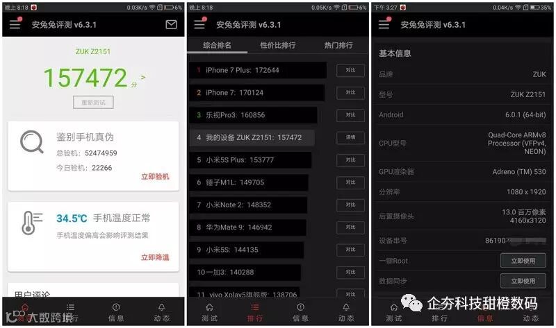 从跑分上看,15.7万的分数和市面上同样搭载骁龙821的机器没有太大差别,都属于顶尖水平。