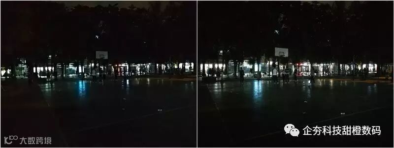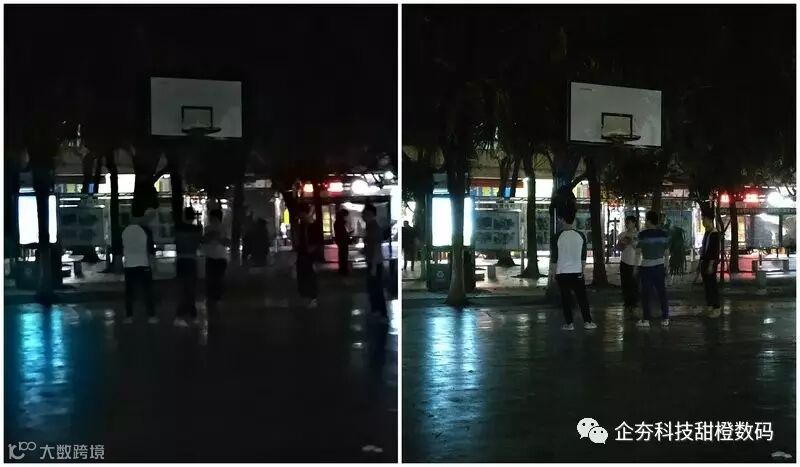 笔者在晚上回家的路上,经过一个没有灯光的篮球场,拍下了这组极限弱光下的样张,这组样张放大后的差距相信不用我说,屏幕前的各位也能够一眼就看出个高低了。