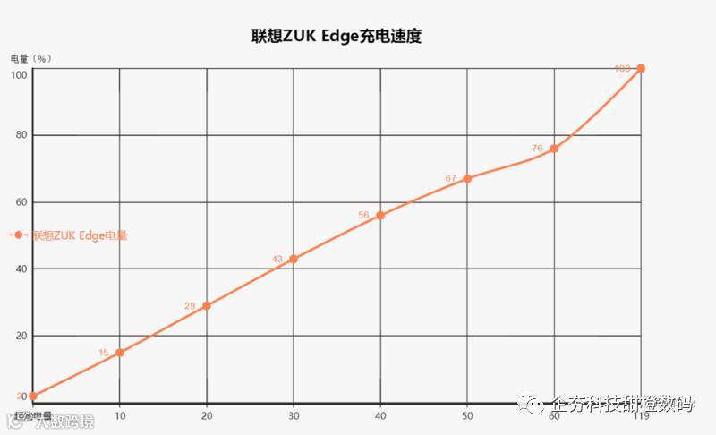 手机起始电量都为2%,在充电期间熄灭手机屏幕并关闭所有后台应用。在充电20分钟后,联想ZUK Edge电量为29%;充电30分钟后联想ZUK Edge电量为43%,联想ZUK Edge完全充满用了119分钟。