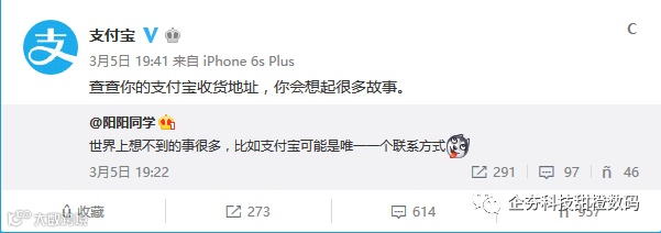 今天有微博网友感慨:“世界上想不到的事很多,比如支付宝可能是唯一一个联系方式。”没想到很快就得到了支付宝官微的回应,但很特殊:“查查你的支付宝收货地址,你会想起很多故事。”这是什么意思呢?其实很简单,只要打开支付宝App,在顶部搜索框里搜索“收货地址”就行了,或者可以依次进入我的-设置-账户与安全-收货地址。
