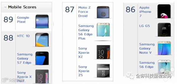 在 DxOMark 按照综合分数排名靠前的智能手机中,Google Pixel 排名第一,HTC 10、Galaxy S7 Edge 和索尼 Xperia X Performance 并列第二。Moto Z Force Droid、三星 S6 Edge、索尼 Xperia XZ 和 Xperia Z5 并列第三。接着并列第四的有苹果 iPhone 7、LG G5、三星 Galaxy Note 5 和 S6 Edge。