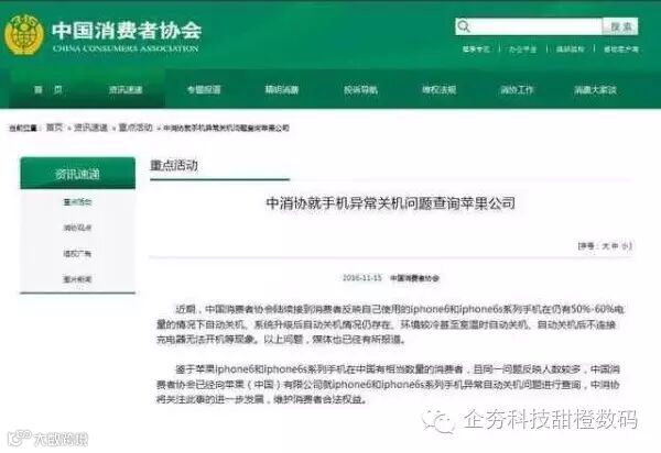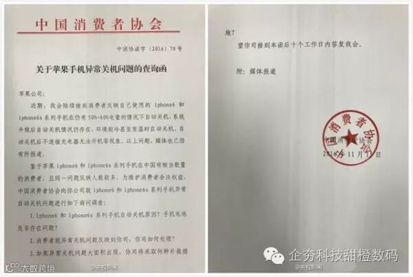 事件终于惊动了“有关部门”,11 月 15 日,中国消费者协会向苹果公司发出查询函,就相关系列手机自动关机的原因、苹果公司的处理措施以及有无补救措施进行询问调查,并要求苹果公司在 10 日内作出答复。