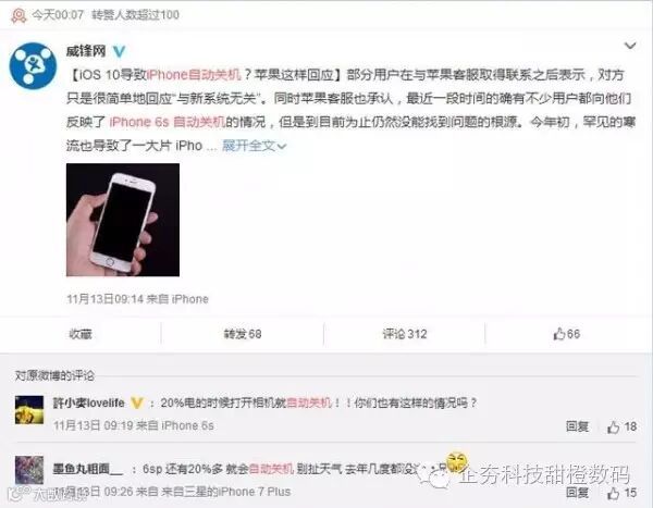 大部分用户都是比较理智的,他们仔细排查出现问题的原因,然后根据情况猜测各种可能,比如天气原因、iOS 10 系统问题、电池故障等等,但随着反映自动关机问题的用户越来越多,他们发现这些原因都无法落实,因为在正常室内温度下,并非 iOS 10 系统的 iPhone 也同样会自动关机。有的用户将 iPhone 带到专卖店检修,或被告知电池正常,更新系统即可修复;或被告知更换新电池,然而即便刷了系统,换了电池,也没能杜绝自动关机现象。