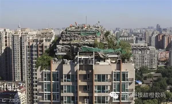 这栋26层的公寓复合式建筑非常简单粗暴地引入了“城市丛林”的概念。这栋位于北京的别墅被建设在了这所大楼的屋顶,周围还摆上了各种“假石头”。