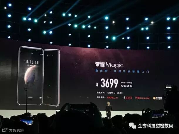 售价方面,荣耀Magic首发价3699元,将于12月16日20:00在华为商城、京东、天猫和苏宁易购开卖。