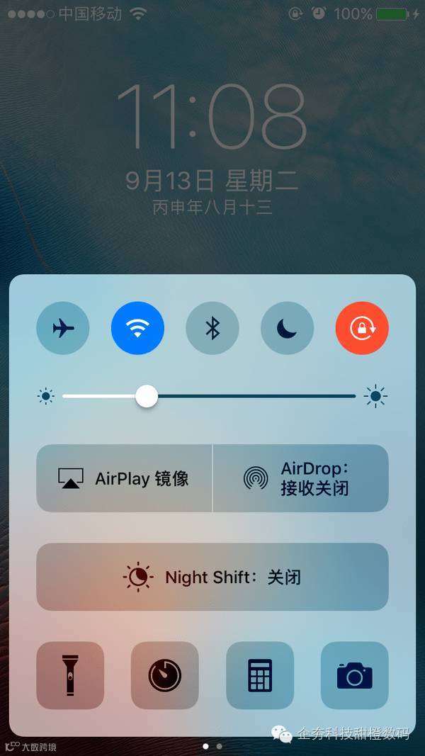 上滑控制中心选择了更为丰富的色彩来提醒用户开关是否打开,并增加了左右滑动切换的两个面板卡片,这导致亮度调节和声音调节分离。