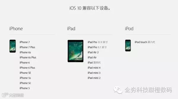 iOS10可面向大多数苹果设备更新,其中iPhone从第5代开始均可以在明天首批获得推送。而此次被苹果抛弃的产品则是多年前发布的iPhone 4s及iPad mini。此外,iPod产品线依然出现在了iOS 10可兼容的设备清单中。