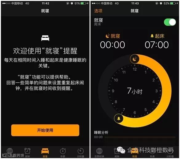 苹果的时钟新增了就寝提醒功能,用户设置了就寝时长和起床时间等偏好之后,手机可以对用户的睡眠情况进行监测和分析,界面设计与Apple Watch如出一辙。