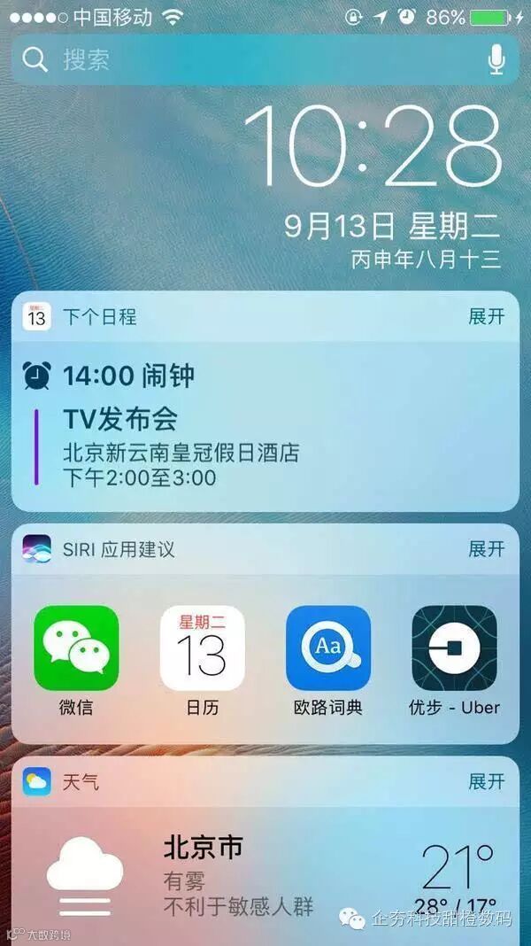 在整体上iOS并没有大的改变,更明显的界面改变来自诸如iMessage、照片、联系人等界面上,最为直观的改变是苹果为iOS 10重新设计了通知查看模块,单个通知或消息所占的面积大大超出以前,并且有更加明确的卡片式设计。整个通知的可操作性和内容呈现都更加丰富。