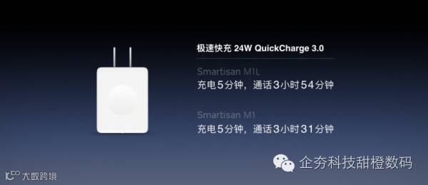 此外,老罗特别提到了新机的电池优化。他指出,除了配有超过四千毫安时的大容量电池和 24W QuickCharger 3.0 快充之外,由于从底层软件上进行了深度的省电优化,M1L 可以达到“充电 5 分钟,通话 3 小时 54 分钟”,M1 可以达到“充电 5 分钟,通话3小时31分钟”的惊人成绩。