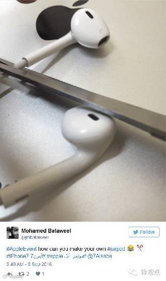 不过,除此之外,喜爱吐槽的各路网友最后还抓着 AirPods 的外观来恶搞了一番,主要是因为 AirPods 外形就是根据 EarPods 改进过来的,所以两者非常相似,不少网友把自己报废的 3.5mm EarPods 耳机线剪掉进而声称自己早已拥有 AirPods 了。
