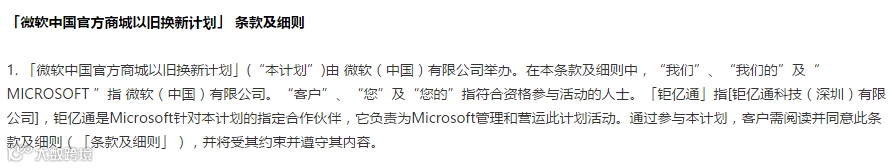 而钜亿通则是“Microsoft针对本计划的指定合作伙伴,它负责为Microsoft管理和营运此计划活动”,虽然没有条款明确出了问题可以找微软,但也不像苹果那样早早就撇清关系。