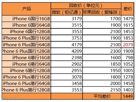 我们可以发现,一台旧iPhone 6的价格在微软和苹果两个回收平台有很大差别,差价最高的是iPhone 6 Plus 64GB国行版,已超过2000元。另外,除iPhone 6 16GB港行版差价仅三位数以外,其余机型差价均超过1000元,所有机型平均差价为1449元。