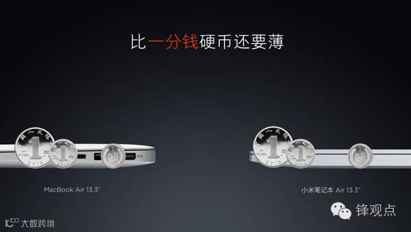 比如这次的发布会,小米又习惯性地拿出苹果的竞品来做对比。但小米的做法是拿MacBook Air的最厚处(17mm)与小米笔记本Air 前段的最薄处(14.8mm)作对比,结果是它们比MacBook Air薄13%。