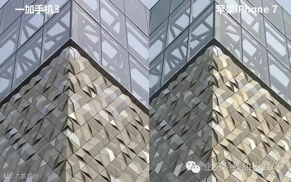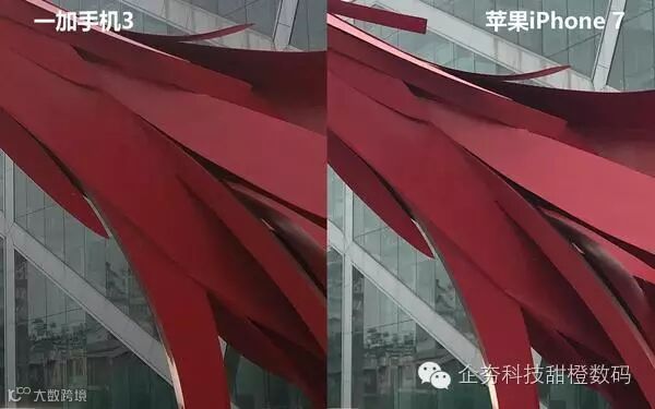 镜头再近一些,第一观感一加手机3拍摄的样张颜色更加鲜艳,iPhone 7样张整体有点泛白,明部暗部的对比不如一加3明显。100%比例原图显示,对于细节的表现力我觉得iPhone 7更锐利一些。