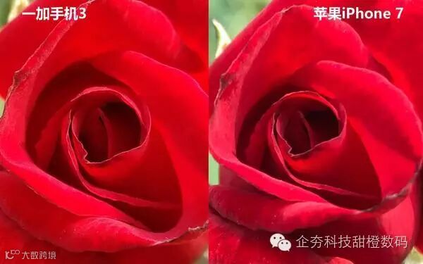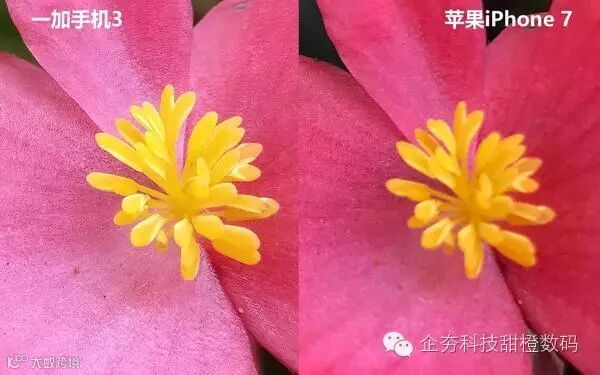 到了微距拍摄了。这组对比更能展现出一加手机3和苹果iPhone 7在色彩饱和度方面的区别,一加3进行了“艺术”加工,视觉效果会更好,而苹果iPhone 7更接近于真实,不知道各位老司机们喜欢哪种风格?至于背景虚化能力,我没感觉f/2.0光圈的一加3比f/1.8光圈的iPhone 7差。