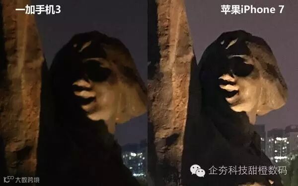 继续将夜拍场景缩小到一个雕塑,一加手机3的ISO再次飙到2500,苹果还是维持200的水准。具体到样张上,一加手机3拍摄的样张还是不如iPhone 7明亮,但感觉iPhone 7背景有些过曝了,而且这回iPhone 7对于噪点的控制也不是太理想。