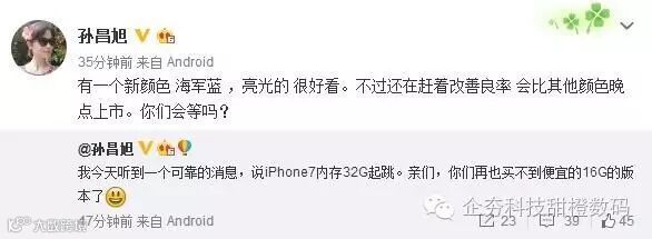 目前的 iPhone 配色一共有银色、金色、玫瑰金色和深灰色四种,但是到了 iPhone 7 这一代,配色方案可能会发生较大变化。国内分析师 @孙昌旭今天在微博上表示,他收到消息得知 iPhone 7 将会增加一个海军蓝的新配色。不过,这一型号的良品率较低,可能会比其它颜色晚点上市。