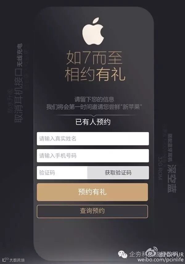 虽然距离iPhone 7发布可能还有半个月的时间,但中国电信已经按耐不住开始接受iPhone 7的预约了。从网友@POPPUR曝光的图片来看,中国电信已经放出了iPhone 7(或许是iPhone 6SE?)的预约页面,输入姓名和手机号码并填入验证码即可预约。页面上出现了“防水升级”、“取消耳机接口”、“无线充电”、“电池更大续航更久”、“搭配蓝牙耳机”、“深空蓝”、“32GB ROM”、“后置双1200W像素摄像头”等字样。