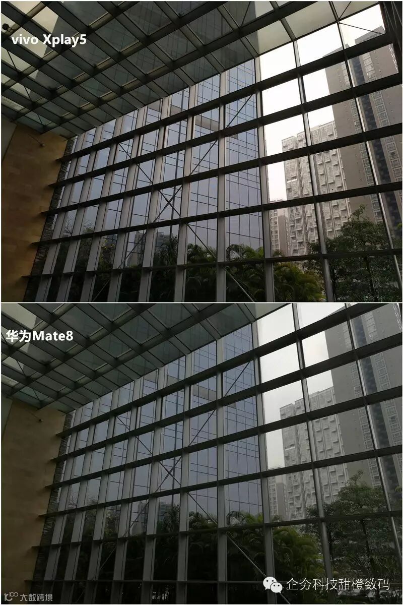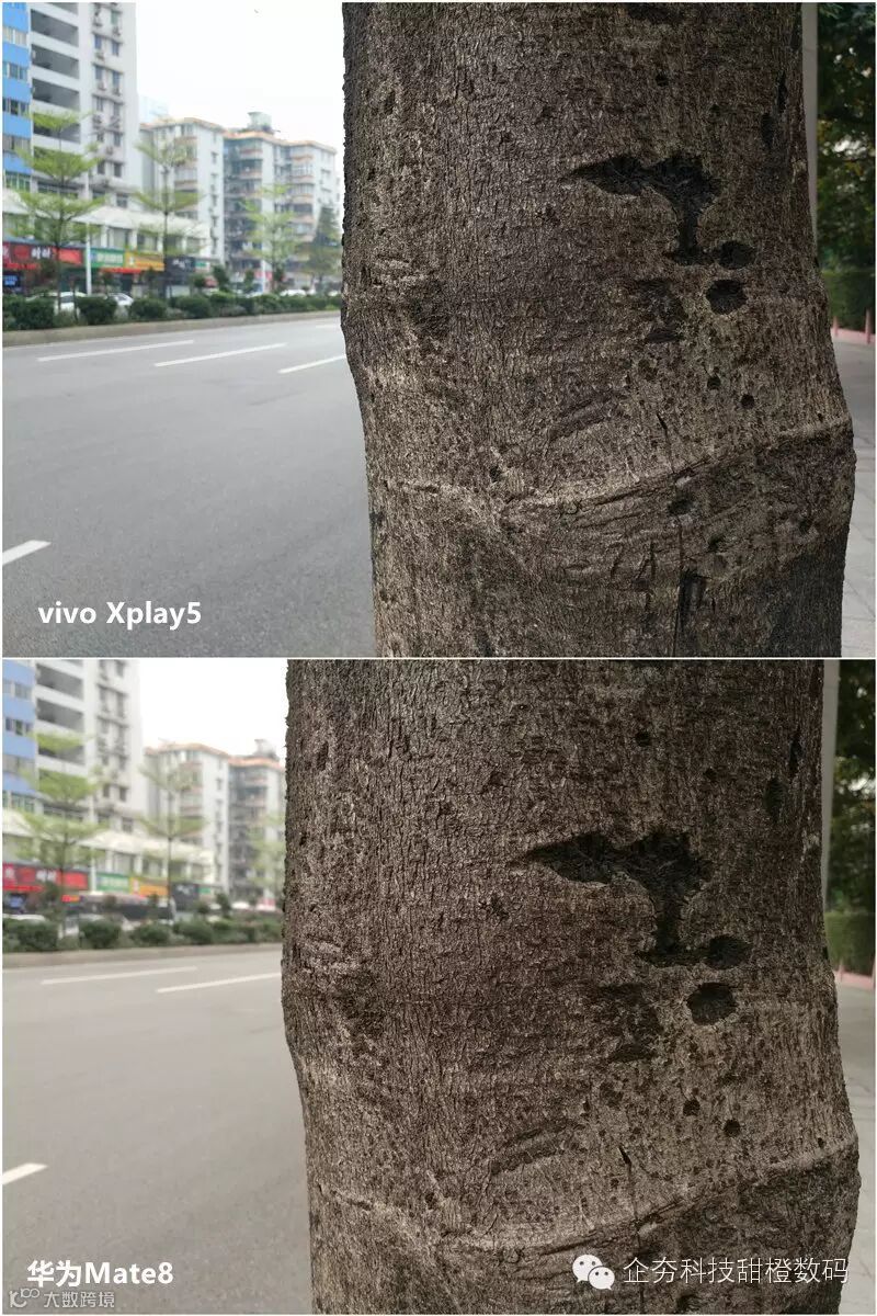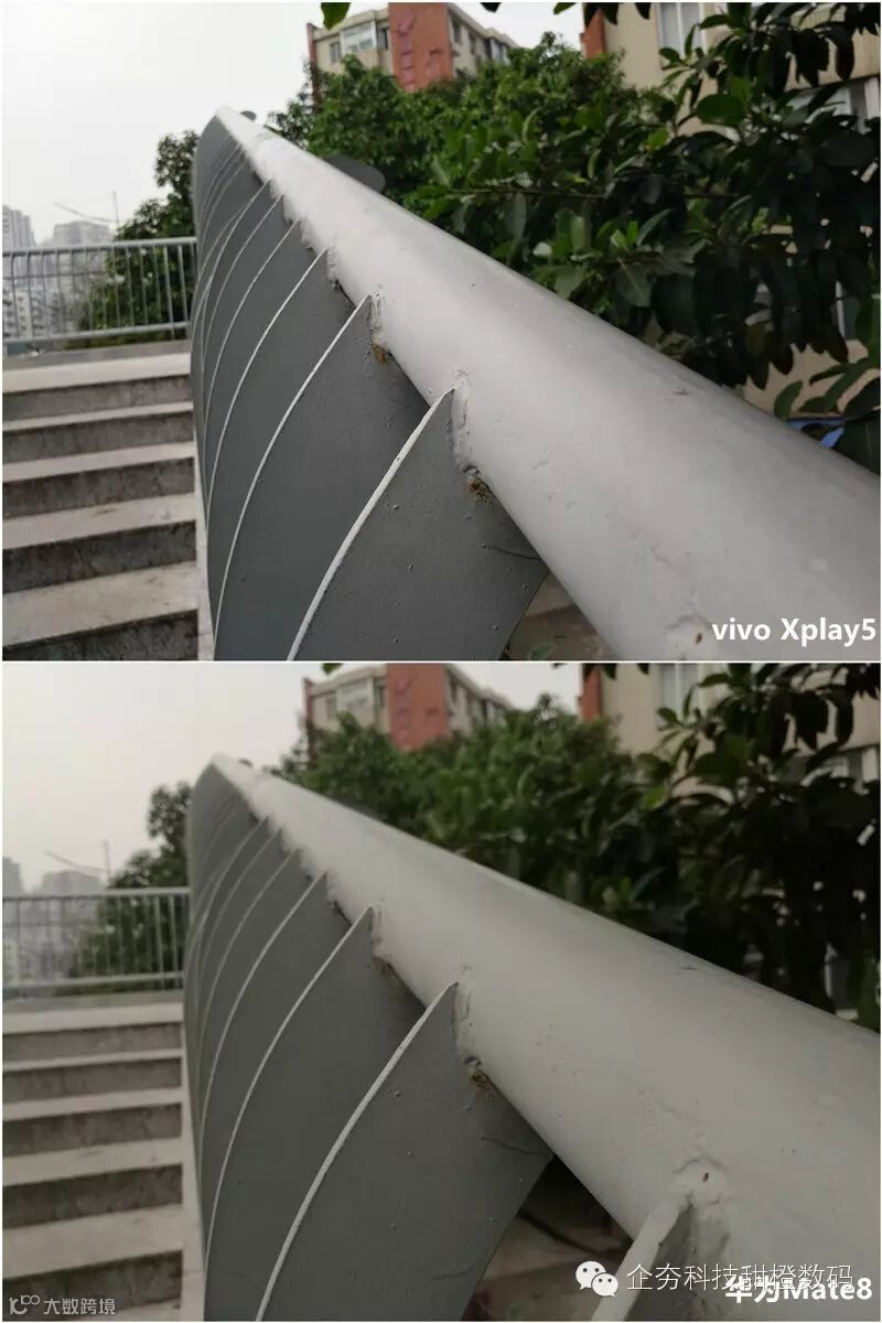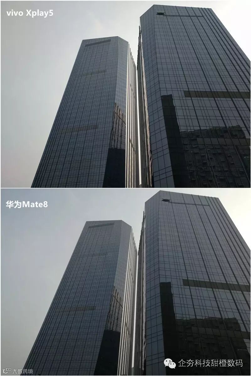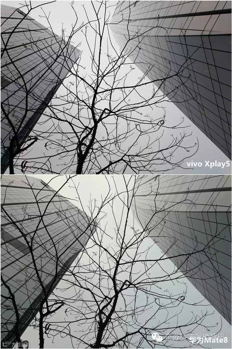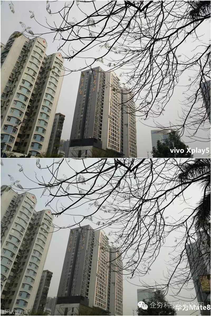 两款手机同样采用索尼IMX298,白天室外光线充足的情况下,对两台手机的样张进行对比,Vivo Xplay 5的画面更加锐利,发色更加浓郁一些,但总的来看显得有些偏暖,而Mate8偏向于真实,画面显得有些平淡,放大样张后发现,Vivo Xplay 5远处建筑中的窗户轮廓依旧清晰可见,而Mate8画面涂抹痕迹严重,已经看不清了。
