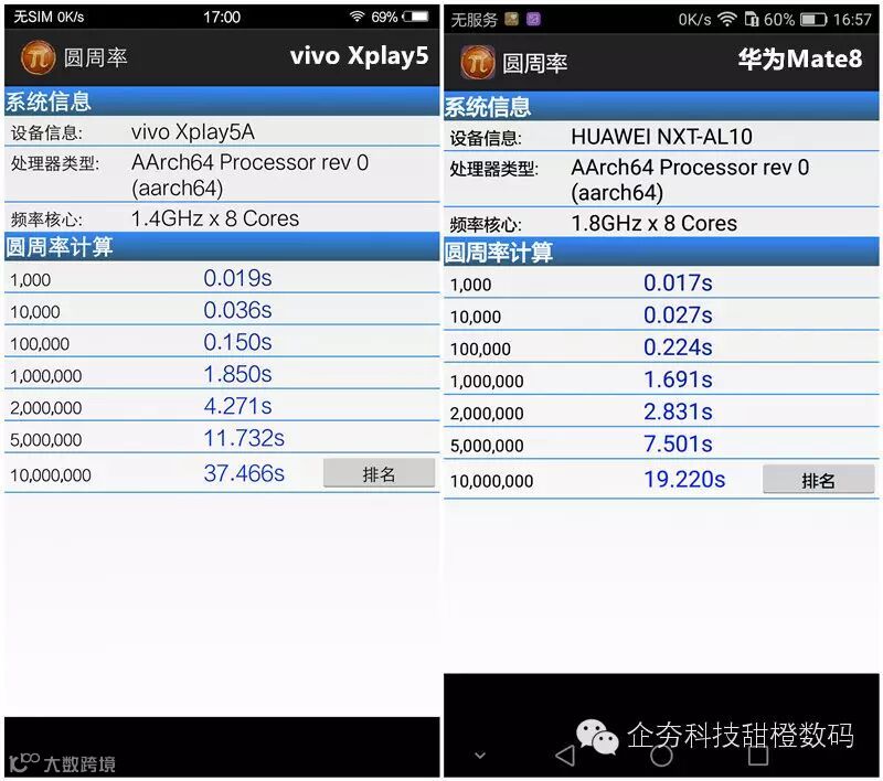 通过让处理器计算圆周率至1000万位,来粗略考察处理器运算速度。上图中能见到搭载骁龙652的vivo Xplay5共耗时37秒,而搭载麒麟950的华为Mate8仅用时19秒,领先幅度较大。