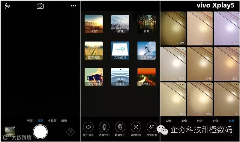 在拍照模式方面,vivo Xplay5相机也相当容易上手,取景界面左右滑动可以切换美颜、小视频和录像的拍摄功能。此外,在相机设置菜单里面还可以选择更多的拍照功能,包括全景和文本矫正等等,还能够在拍照界面直接录制微信小视频。当然了PDAF相位对焦、专业模式、电子对焦等性能也是一样不少的。