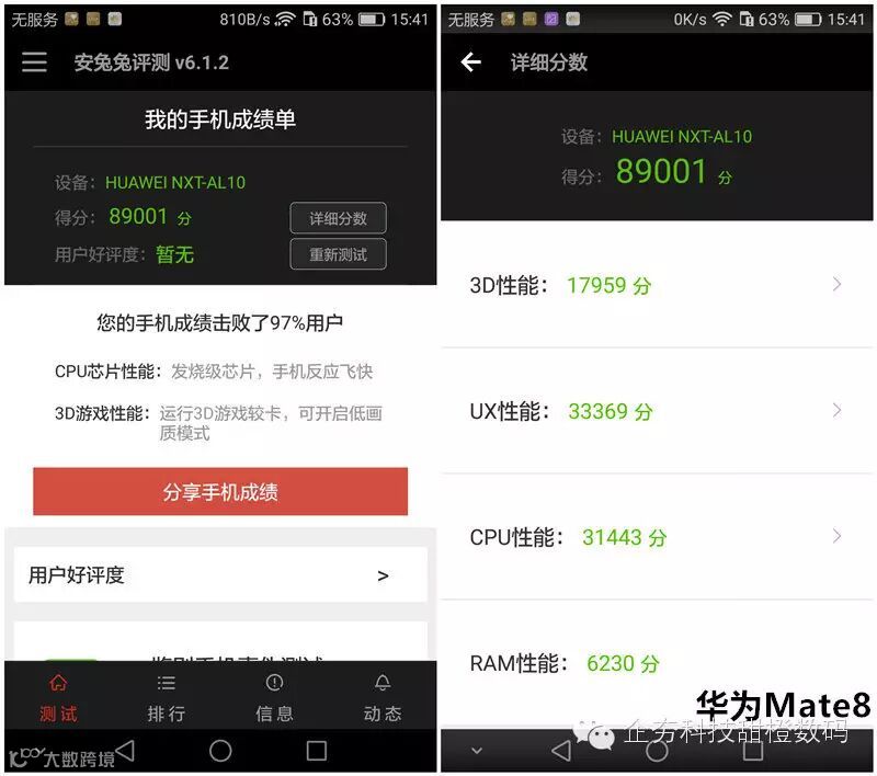 上图中,可见骁龙652得分851,麒麟950得分872,成绩上来看华为mate 8稍高一点。