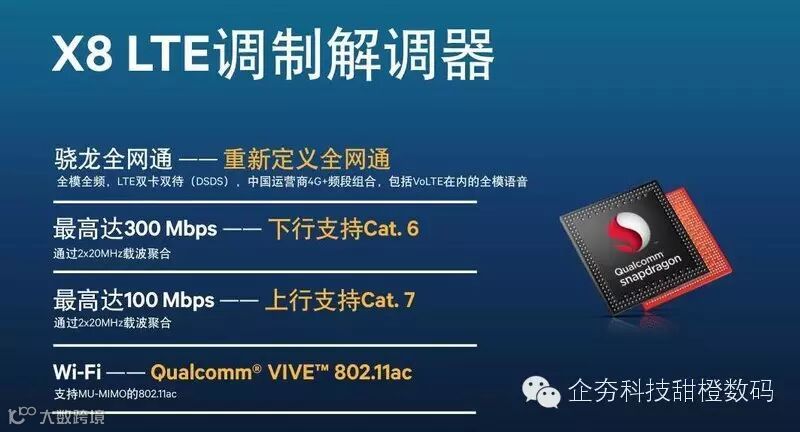 高通骁龙652/650两枚芯片还采用X8 LTE调制解调器,支持4G+网络,可实现最高300Mbps的下载速度以及100Mbps的上传速度,WiFi连接技术则支持最新的MU-MIMO的802.11ac标准。值得关注的是,搭载高通骁龙652/650处理器芯片的手机,都可以实现LTE双卡双待、全频全模和VoLTE技术。