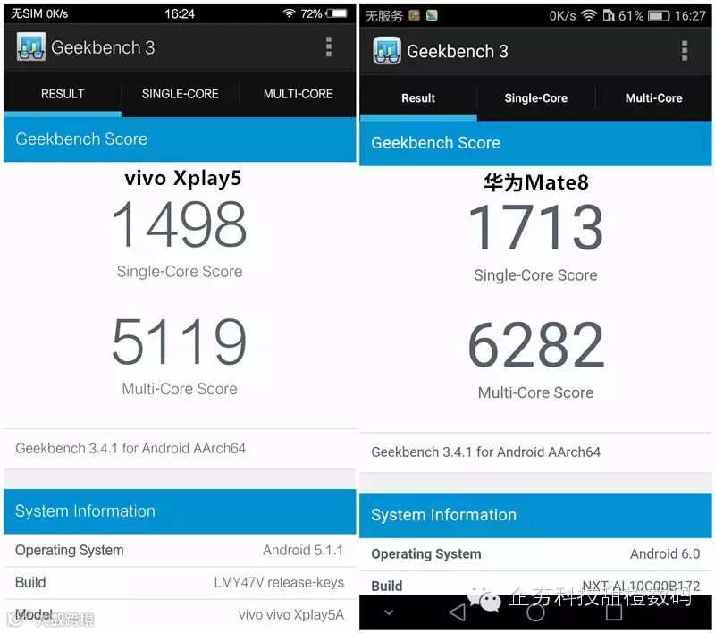 然后我们选择Geekbench 3进行对比,主要是考察这两款手机的CPU和内存系统的运算能力,给我们一个更加直观的展现: