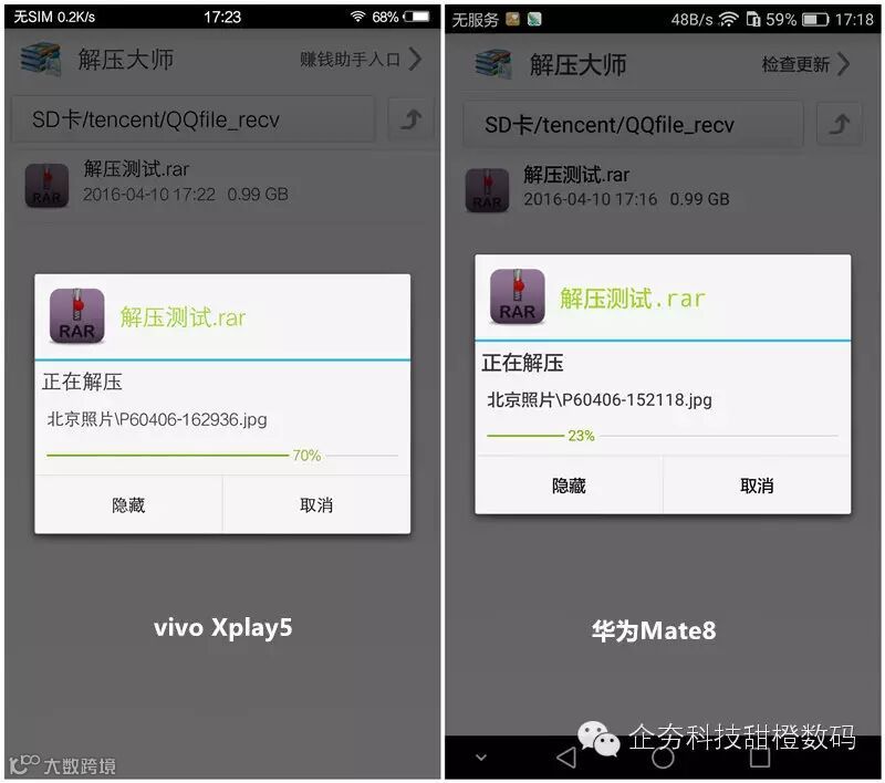 然后我们用1GB文件的压缩和解压缩用时考验这两款手机处理器的具体运算数据的能力。首先我们来看一下华为Mate8,其解压/压缩1G文件的时间分别为1分11秒和2分58秒,而vivo Xplay5解压/压缩1GB的文件分别用时1分02秒和2分31秒。通过这项对比我们可以非常明显的看出麒麟950在高强度运算方面对比骁龙652时还是有些力不从心,从这里我们也能够看出,其实跑分也不能决定一切嘛~