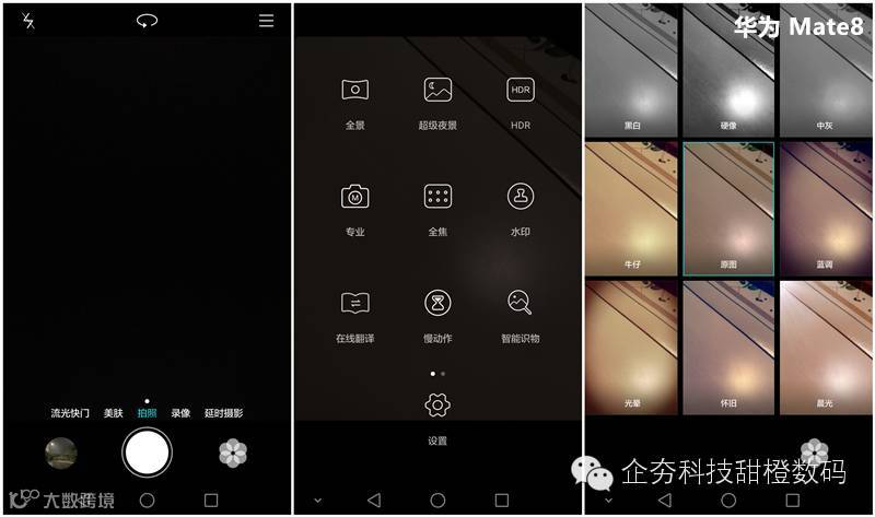 华为Mate 8的拍照选项非常丰富,常用的功能应有尽有,智能场景、HDR、连拍优选等功能也相当实用,更容易在不同的场景下拍出好照片,整体风格延续了华为家族式的设计传统。华为Mate8的专业模式也颇有点意思,相对于其他机型来说,华为Mate8的专业模式专业性更强,通过简单易操作的界面与拨盘,我们可以轻松地对白平衡、IOS、EV等参数进行调节,快门时间可以在从1/4000秒到8秒之间调节,完全了满足了拍照达人在各个场合中的拍照需求。