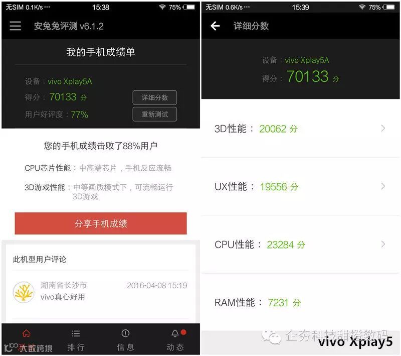 在实际测试过程当中,两者在画面感上并没有给予我们太多的差异,两台机子都能达到60fps流畅的画质(vivo Xplay5 0.3误差可以忽略),所以在这一环节上,两者打成平手。