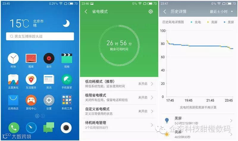 8.2mm厚度的魅蓝 note3塞下4100mAh大容量电池,结合系统级的省电优化,在作者几个小时的“折磨”+一整个下午拍摄以及跑分写评测的轮番撸弄下,魅蓝note3还剩余73%电量百分比,这个数字十分的可观。
