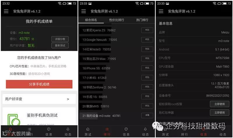 从最新版的安兔兔v6.1.2跑分来看,2GB版的魅蓝note3跑出了43781分,这个分数排在采用helio X10的前辈MX5之后,但无论如何我们也不能忽略了价格上的因素,笔者认为对于一款千元级别的手机来说,性能已经足够出众了。