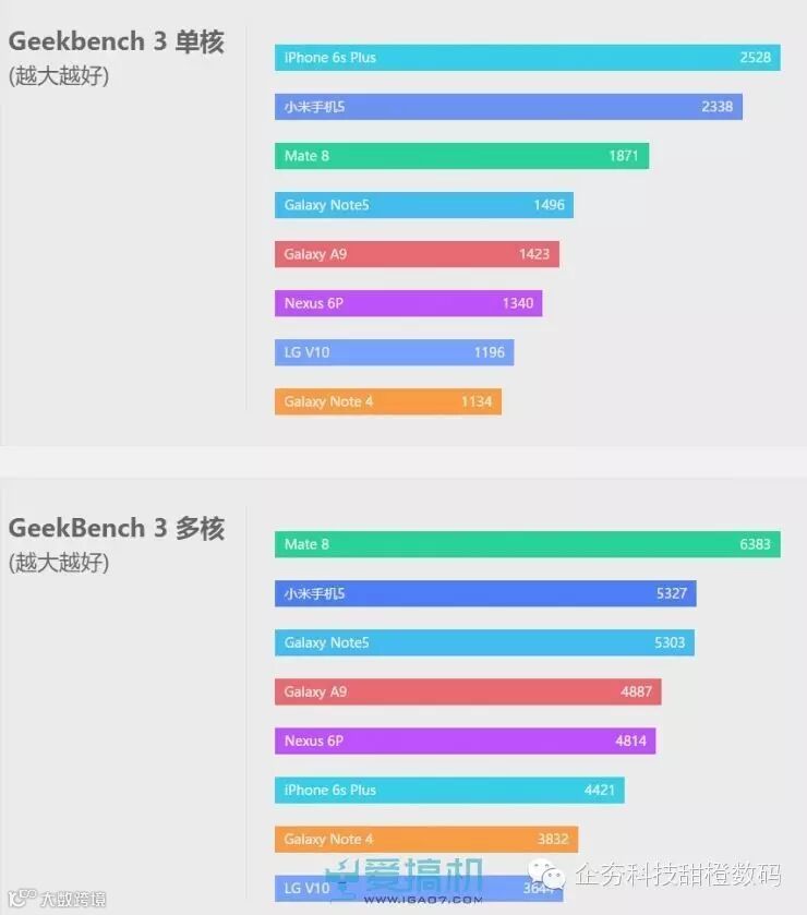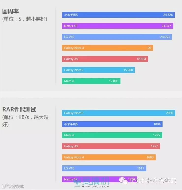 小米5在Geekbench测试中表现出仅次于iPhone 6s Plus的单核性能,多核性能上也战平了八核的Galaxy Note5,但和同代的麒麟950还有一段距离。此外,在需要多核性能的圆周率和RAR的测试,其表现在旗舰中也只算是中规中矩。