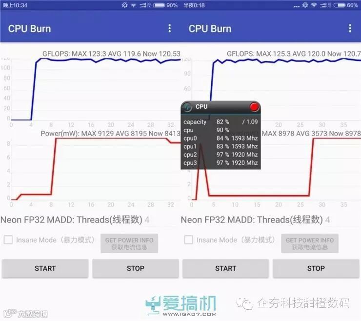 四核全开拷机,浮点运算性能在120GFLOPS左右,介于八核全开的Exynos 7420和Kirin 950之间。可以维持27秒的满频,接着大核降频到2080MHz维持到了1分50秒左右,相比骁龙810的热稳定性大幅提升,但和Kirin 950那种变态级的频率稳定度还有差距。