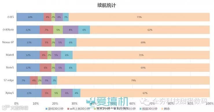 小米5搭载3000mAh电池,经过了30分钟大型游戏(NBA 2K15),各30分钟的wifi和4G上网(包括网页浏览、微博、贴吧各10分钟),1小时音乐播放和30分钟本地视频播放,整整3个小时的续航测试后,剩余电量73%。