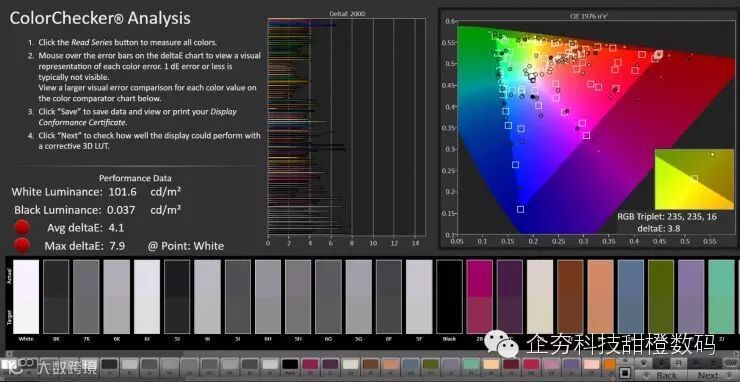 机器在默认的标准模式下,其色准表现比自适应模式要差很多,所以我们在自适应模式下进行色准测试,机器104色平均deltaE为4.1,最大7.9,表现不是很好。作为对比Note5是1.8,S6 edge+是2.6,S7 edge是2.9。
