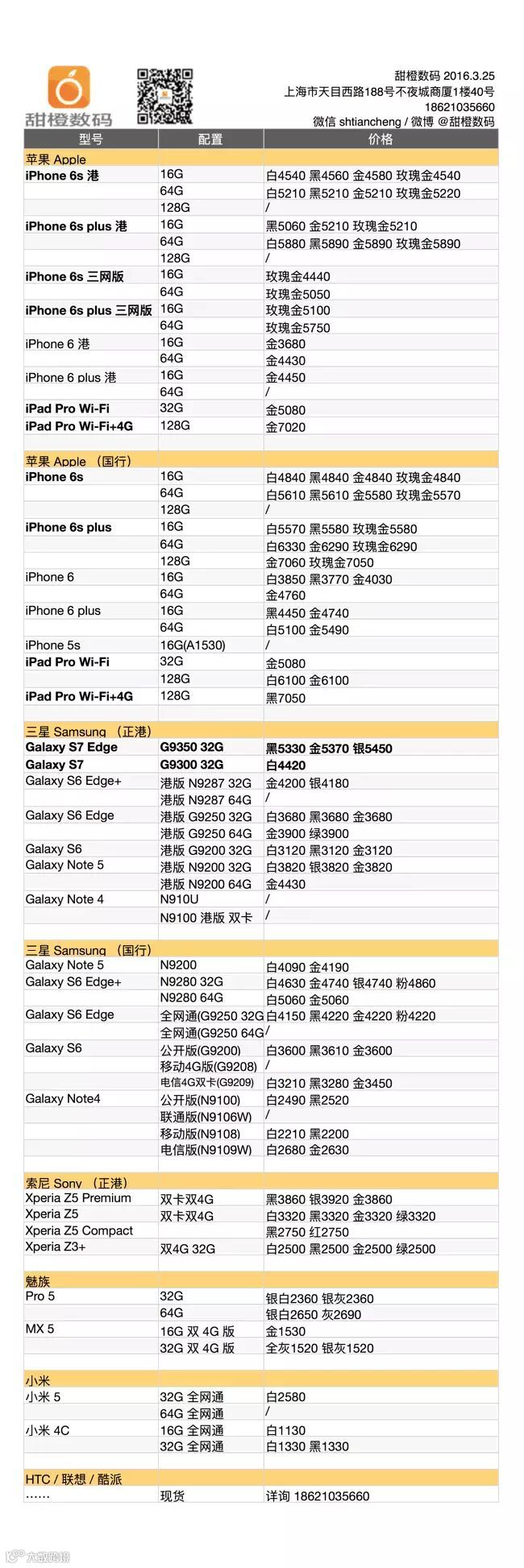 某些 iPhone 6s 及 plus 港版小幅反弹 10 元,三网版稳定;iPhone 6 及 plus 走低;三星 Galaxy S7 和 S7 Edge 价格逐渐走低,今天再降 6、70;充电 5 分钟通话 2 小时的 Oppo R9 到店。