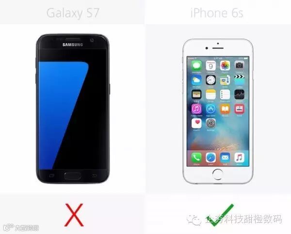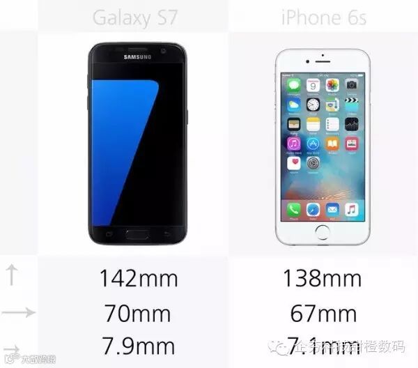 三星Galaxy S7在机身正面上要比iPhone 6s高4%,宽5%。iPhone 6s在厚度上要薄10%,而令人感到好奇的是两款手机都要比前代更厚。