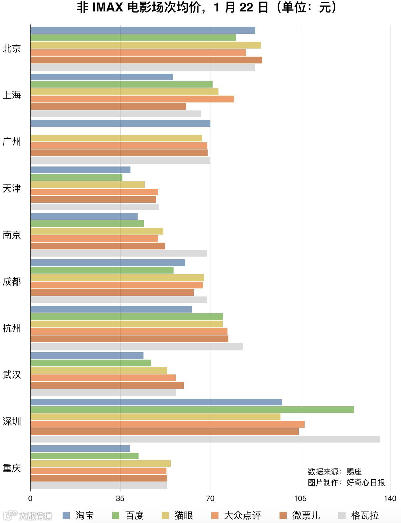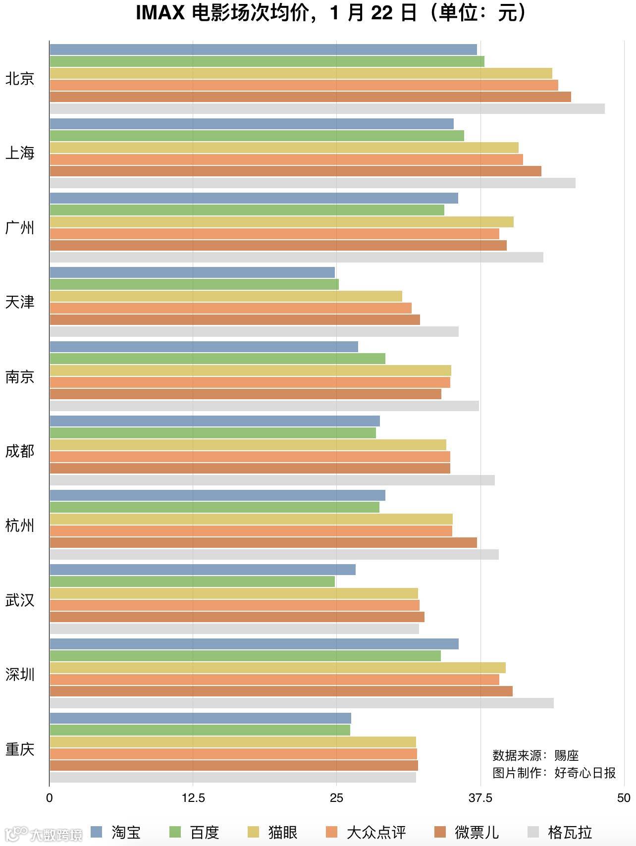 不过对比 IMAX 票价数据后,你会发现用它买票还是有点贵。淘宝电影和百度糯米各自在一些城市能够买到最便宜的 IMAX 电影票,最高和最低的票价差价能达到 15 元。