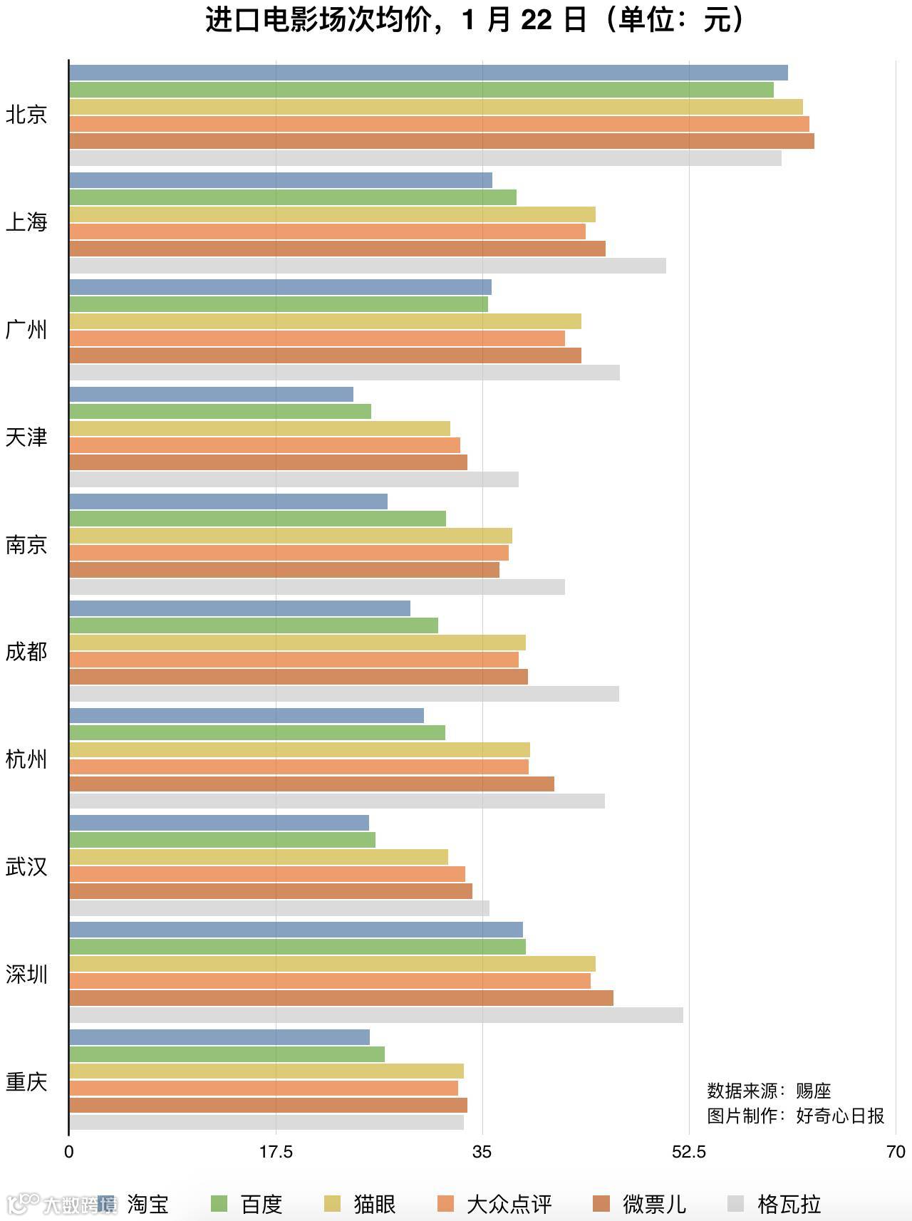 为了回答这些问题,《好奇心日报》和电影票比价应用赐座合作,分析了格瓦拉、猫眼、微票、糯米、淘宝、点评这六个服务,在北京、上海、南京、天津、广州、成都、杭州、武汉、深圳、重庆这十个城市,在线购买电影票的价格——260 场电影的 15600 个票价数据。