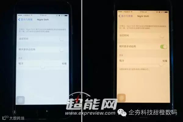其实这时候的黄屏就是色温在6500K以下,多在4500K左右,这对某些有较多色彩的APP看起来并不舒服,算是护眼和使用体验不可得兼,而苹果的Night Shift则做得比较智能,可根据当地日落和日出时间来自动开关黄屏模式。