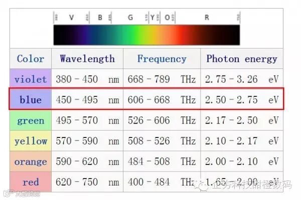 至于降低蓝光,这里的蓝光是指手机屏幕背光中发出的蓝光,全称为高能短波蓝光,从名字中可以看出蓝光的特征是高能量、短波长,蓝光在光谱图中为450-495nm,光子能为2.5-2.75eV,这是可视光中最高能量的光线。