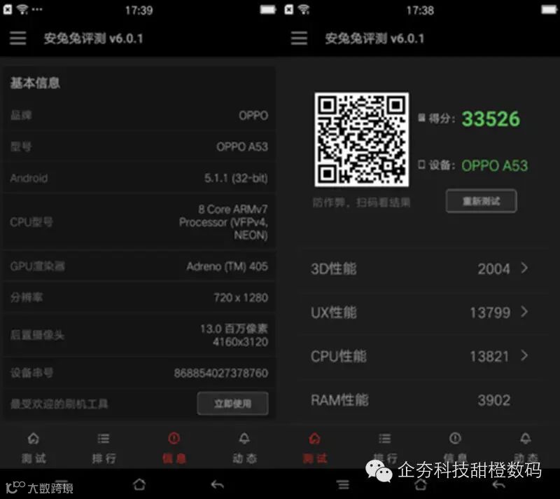 OPPO A53采用64位高通616八核处理器,集成Adreno 405 GPU,内存配置为2GB RAM和16GB ROM,安兔兔跑分成绩为33526相比R7s来说,主要是RAM/ROM有缩水,属于中端主流水准,看高清视频打游戏基本都可以胜任。