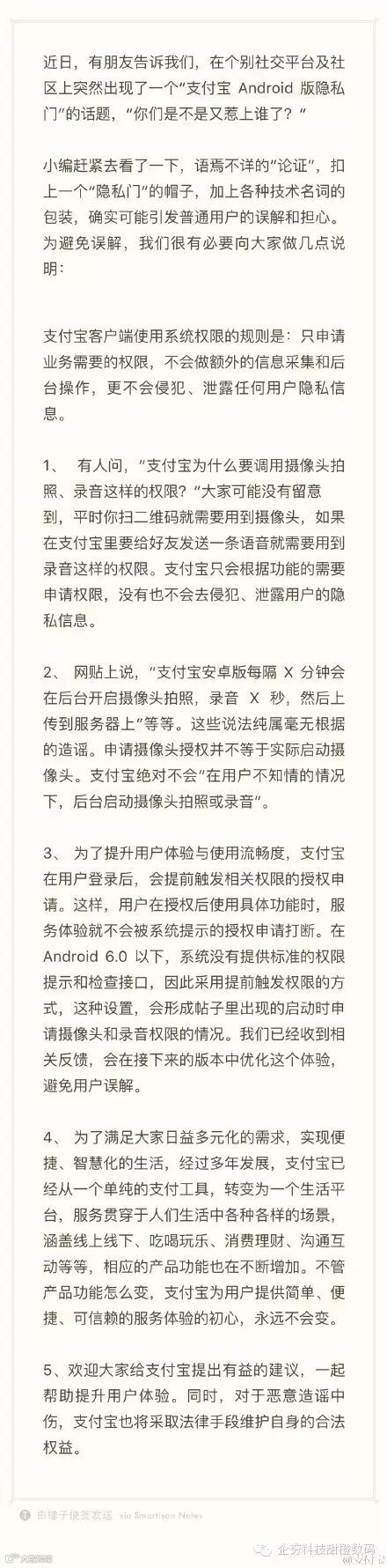 支付宝方面今日通过官方微博发表回应称,个别社交平台的“支付宝Android版隐私门”话题,用语焉不详的“论证”,扣上一个“隐私门”的帽子,加上各种技术名词的包装,确实可能引发普通用户的误解和担心。支付宝只申请业务需要的权限,不会做额外的信息采集和后台操作,更不会侵犯、泄露任何用户隐私信息。